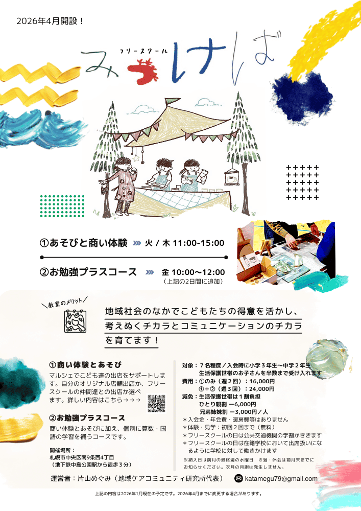 こども達がマルシェでオリジナルのお店を出店できるフリースクールが誕生しました。まちづくりの研究の一環として2年前から市内のNPOと連携し、効果的な運用ができるようになりましたので生徒さんを募集します。詳しくは「フリースクール」のサイトとちらしをご覧ください。